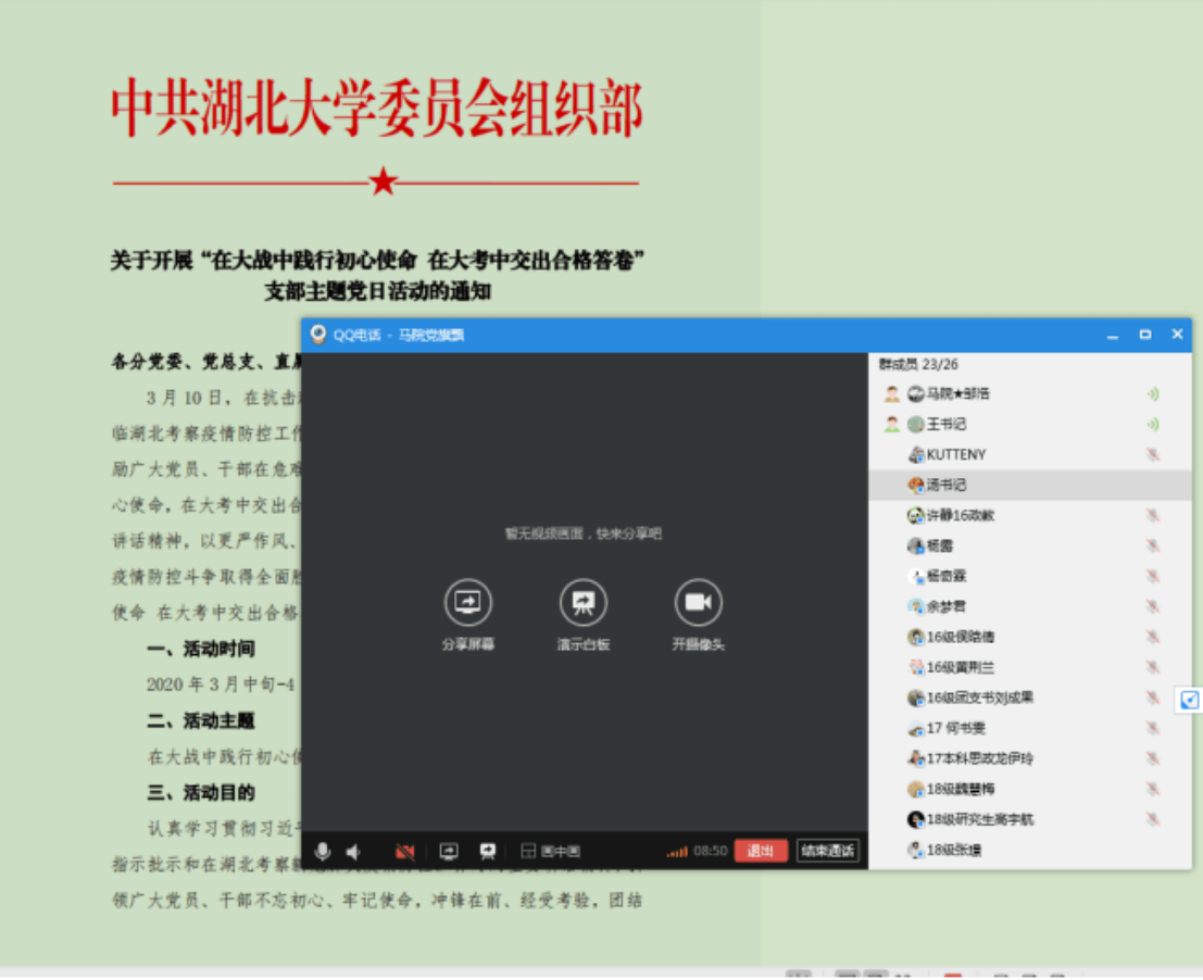 组织员邹浩介绍了有关学校党委组织部《关于开展“在大战中践行初心使命 在大考中交出合格答卷”支部主题党日活动的通知》。为进一步传达学校主要文件精神,院党委副书记王雄对开展3月份党支部主题党日活动作出3点说明:一是严格按照学校下发的文件内容,重点围绕“做什么,怎么做”,特别是结合下沉到社区的抗击疫情案例,深入开展讨论和交流;二是开展好主题党日活动,把主题党日作为巩固“不忘初心、牢记使命”主题教育成果的具体行动。通过学习各类媒体、平台有关抗击疫情、下沉一线的真实事例,培养和提高党支部党员、预备党员和入党积极分子的责任担当,大力营造强信心、暖人心、聚民心的良好氛围;三是不断增强“四个意识”,坚决做到“两个维护”,对当前国内外抗击疫情的认识和行动,始终与党中央保持高度一致,敢于同不正确的言论做斗争,并在斗争中不断提升自身政治素养和理论素养。王雄副书记还对特殊时期做好本学期学生党建工作提出了3点意见:一是各党支部要结合各自实际,坚持每月召开网上党支部大会,并鼓励多形式开展党员活动;二是支委成员要协助支部书记做好本支部党建工作;三是毕业生党员要严格遵守党章规定的各项纪律要求,按时参加所在党支部的活动。