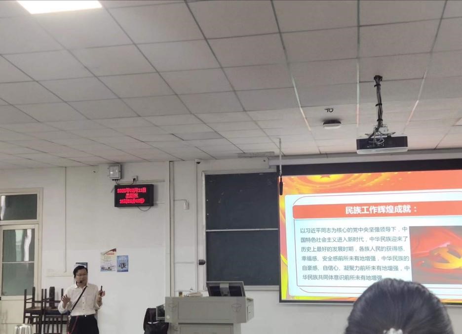 授课过程中,杨海军给同学们详细介绍了中央民族工作会议精神、在党的坚强领导下我国民族工作取得的辉煌成就、高校做好“铸牢中华民族共同体意识”相关工作的要求,并引导同学们学习领悟我国民族工作实践中的历史智慧。他勉励同学们,作为新时代的大学生,应自觉学习马克思主义民族观和习近平总书记在中央民族工作会议上的讲话精神,铸牢中华民族共同体意识,维护民族团结,为实现中华民族伟大复兴的中国梦奉献青年力量。