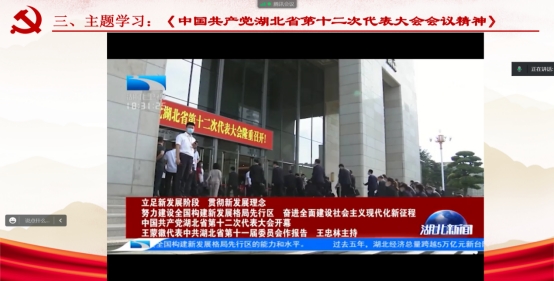 在集体重温入党誓词,诵读党章第二章《党的组织制度》部分后,6月份主题党日活动正式开始。刘欣悦同志对中国共产党湖北省第十二次代表大会会议内容要点进行了讲解,并带领大家共同学习中国共产党湖北省第十二次代表大会会议精神视频资料。