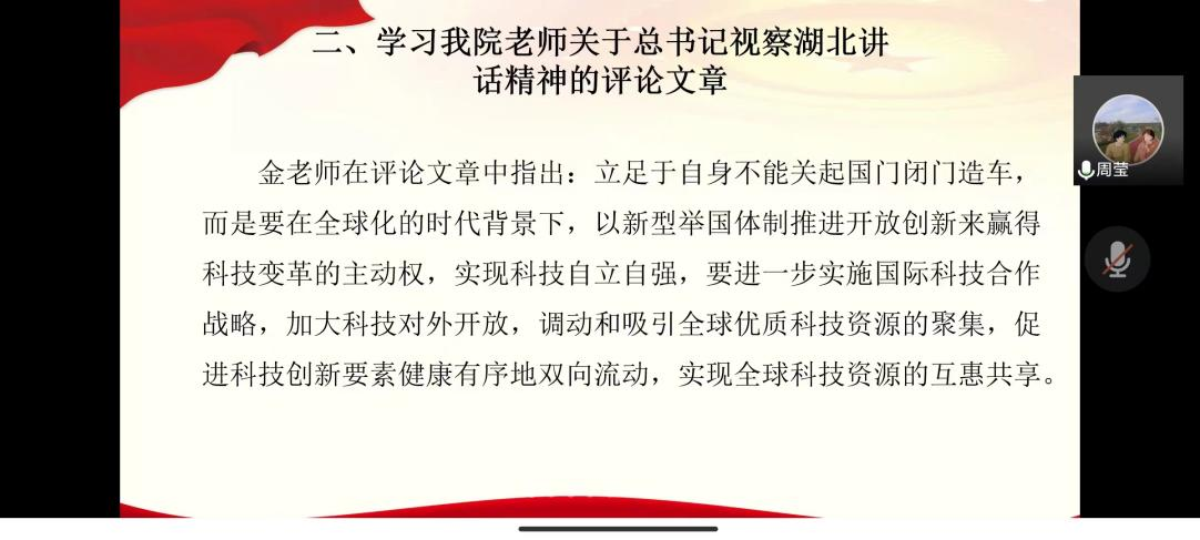 活动中,全体成员在观看习近平总书记视察湖北的新闻视频后,一起学习了我院王敏、金姣两位老师近期发表在荆楚网“地评线”栏目上关于学习习近平总书记视察湖北讲话精神的时评文章。