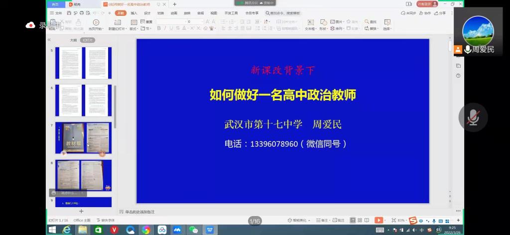 3月26日上午,武汉市第十七中学周爱民老师受邀为我院同学开展“新课改背景下如何做好一名高中政治教师”教育教学实训线上讲座,传授一线教学经验,讲解教学方法以及教学技巧。本次讲座由政教系副主任胡银银老师参与并主持,学院副院长徐信华老师、涂用凯老师和部分学院实习指导老师参加,思想政治教育2019级实习同学、2020级见习同学参加讲座。