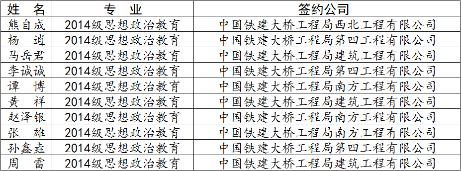 9月19日,中国铁建大桥工程局集团有限公司来我校招聘应届毕业生。全校共11人与该集团下属公司签约,其中,我院2014级本科应届毕业生有10人分别被该集团南方工程有限公司、建筑工程有限公司、第四工程有限公司等签约,从事党务、行政等工作。