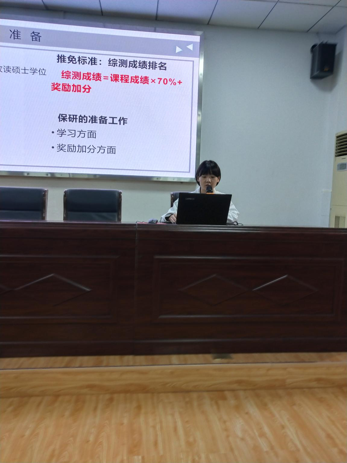 第三位进行分享的是保研至中国地质大学的冯晓宇。她为大家营造了一个十分轻松的谈话环境,学姐针对自己保研过程中存在的误区对同学们提出了一些建议。谈话过程中,她指出在提高学习成绩的同时,也要积极参加各种校级、院级活动,把奖励加分提上去。
