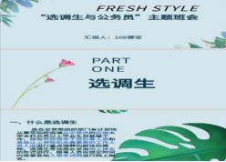 10月12日主题班会由106寝室承办,主题是考研与考公。18级学生即将面临考研就业选择。该寝黄诗雨同学以“选调生和公务员”为主题,向我们解释了什么是选调生,选调生与公务员的区别以及公务员考试的基本内容、框架。黄诗雨同学的细致耐心的讲解吸引了同学们关注,大家在她的简洁明了的陈述中对选调生、公务员有了更多认识。