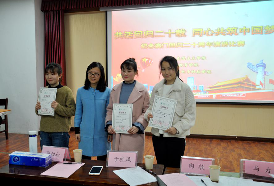 为纪念澳门回归二十周年,激荡广大青年学生的爱国情怀。12月13日下午,我院和物理与电子科技学院、教育学院在物理与电子科技学院314教室联合举办以“共话回归二十载·同心共筑中国梦”为主题的演讲比赛。英国365集团郭劲松老师、于桂凤老师,物理与电子科技学院陶敏老师、教育学院马力老师受邀担任此次大赛的评委,三院50余名研究生参加了此次活动。