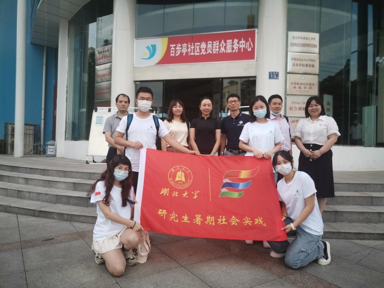 (实践团队成员与百步亭社区党委副书记王波等人合影)