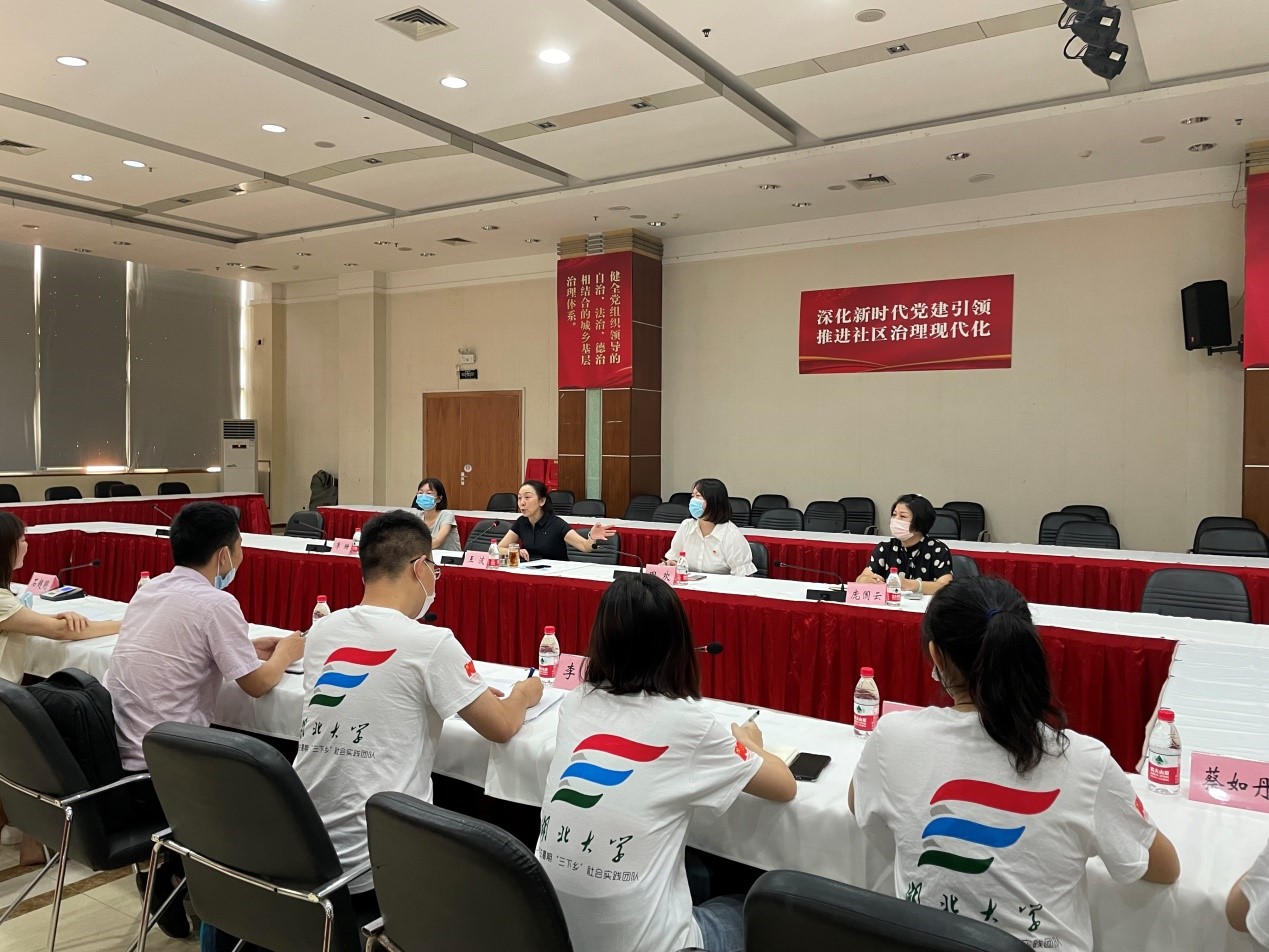 (调研团队成员与百步亭社区党委副书记王波等座谈)