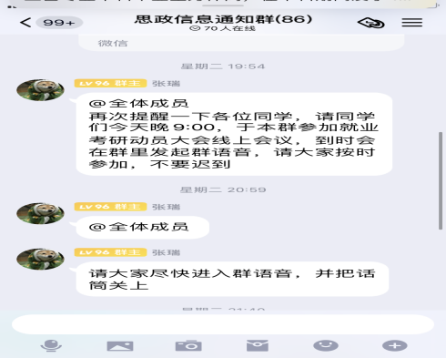 7月13日晚9点,英国365集团利用QQ群语音,召开2022届毕业生就业考研动员大会,院党委副书记晏妮、2018级思想政治教育班班主任邹浩以及全体同学参加会议。