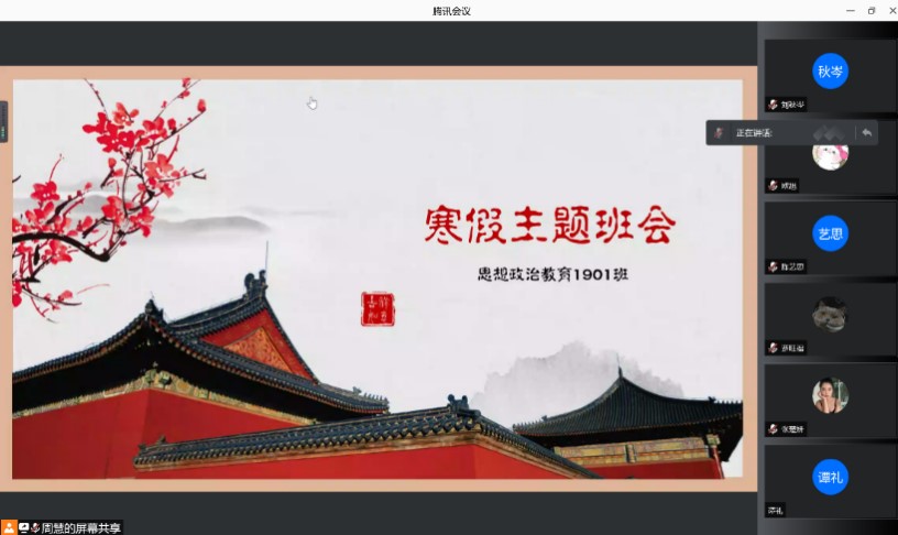 2月10日晚,思想政治教育2001班于线上召开“传承中华传统文化,感恩敬老爱老”主题班会,班主任程亚勤老师以及全体同学参加,本次会议由班长刘思轩主持。