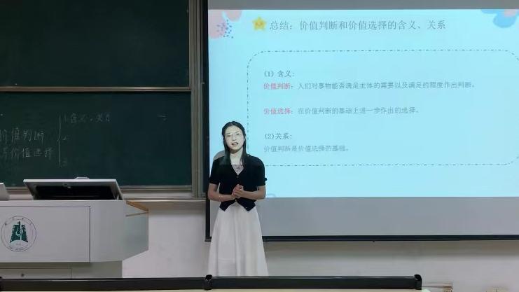 21级学科思政研究生韩鑫轲的授课内容是高中政治必修四《哲学与文化》中的“哲学意义上价值的含义”。他采用情境教学法,由两个模拟情境引出哲学意义上价值的内涵,通过对价值内涵的深入讲解,使学生提高价值理解力、价值判断力、价值鉴别力,最终引导学生树立正确的价值观。