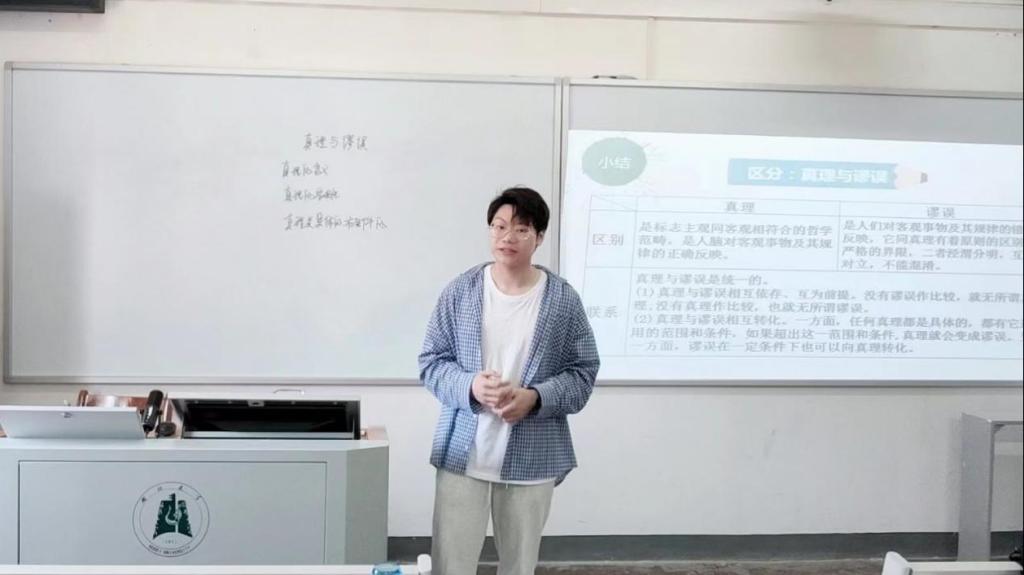 21级学科思政研究生刘传禹的授课内容是高中政治必修四《哲学与文化》中的“真理的含义与基本属性”。他采用议题式教学,将硬币穿杯的魔术贯穿整个教学过程,通过三个议题,分别讲授真相与假相的含义、真理的含义和真理的客观性,使学生明白追求真理是个永无止境的过程,并鼓励学生要敢于追求真理,对真理葆有自信。