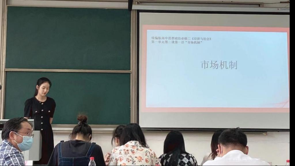 21级学科思政研究生李俊娴的授课内容是高中思想政治必修二《经济与社会》中的“市场机制”。她采用情境教学法,以电影行业的整个发展过程来导入课程,用市场配置电影资源的三种机制使学生明白社会主义市场经济的重要性和优越性,提升学生对社会主义市场经济的认同感,树立制度自信和道路自信。