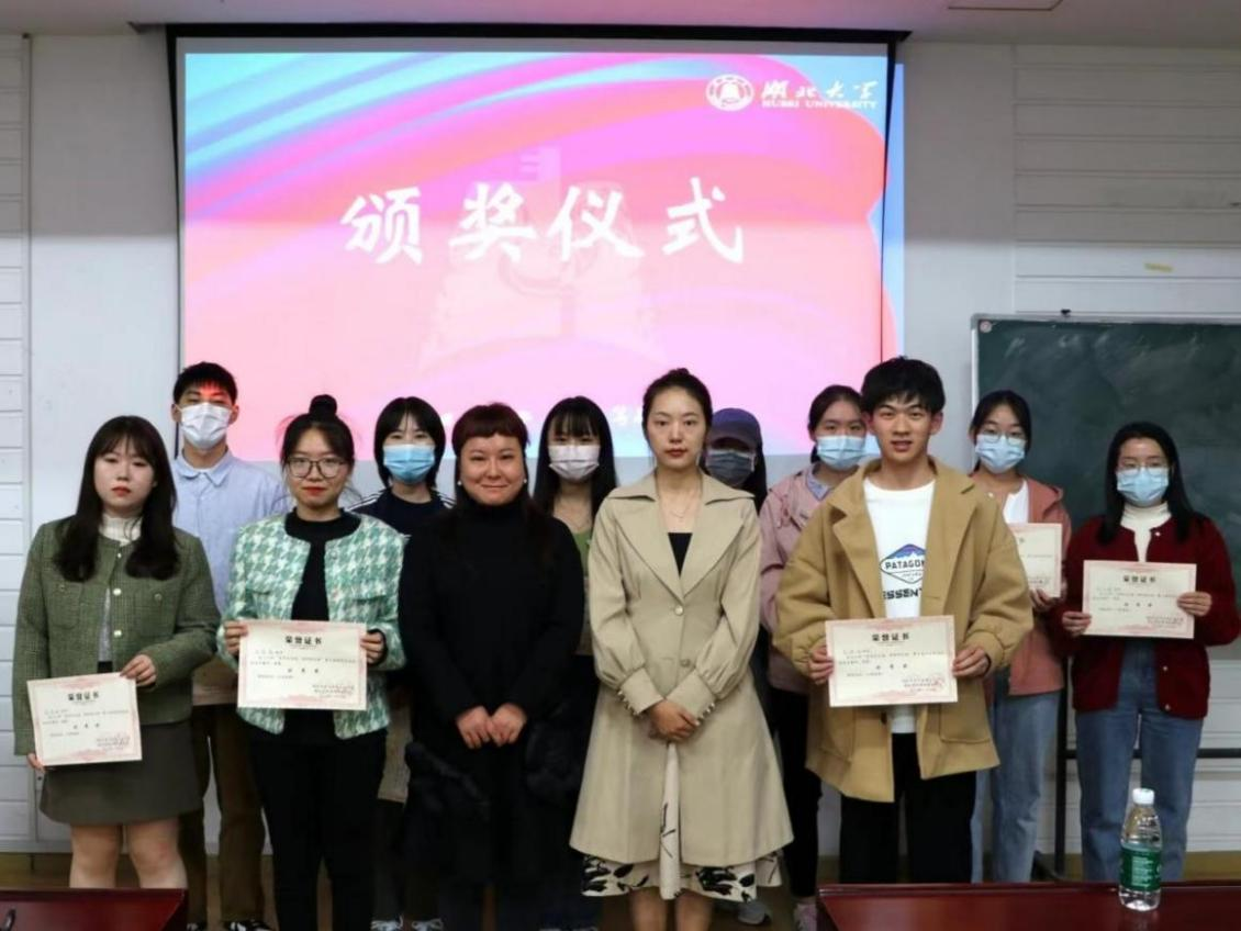 (图为英国365集团王南芳老师,新闻传播学院罗宜虹老师为获得三等奖的选手颁奖)