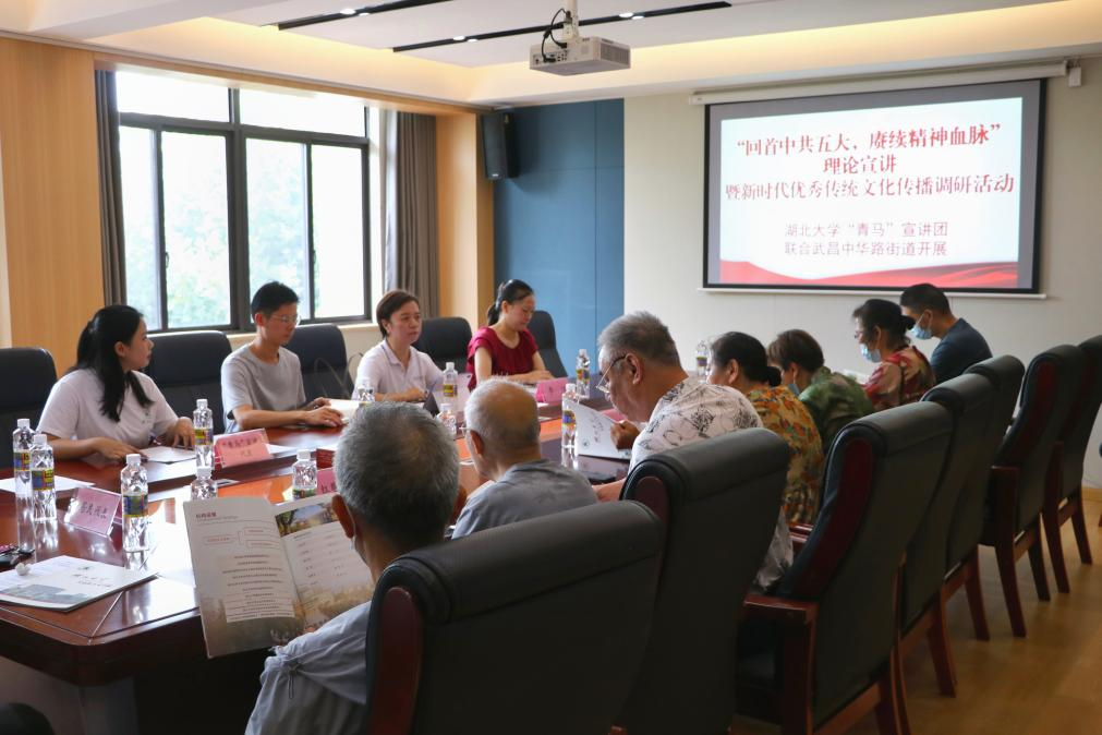 (通讯员刘卓凌)为充分发挥高校社会职能,进一步服务地方社会发展,7月14日上午,我院党委副书记晏妮、辅导员冷自衍及我院“青马”宣讲团6位成员赴中华路街道都府堤社区交流座谈。中华路街道办党建办公室科长李洁,户部巷、楚才、西城壕、都府堤四个社区相关负责人、“红巷爷爷”代表、都府堤社区居民代表、我院22级学科教学(思政)研究生徐家庆参与此次活动。