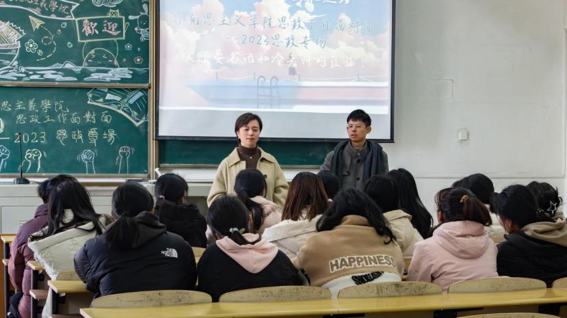 交流中晏妮书记从学院历史沿革、学院文化、学生学风建设、思想政治工作开展情况等方面向大家进行了详细的介绍。她说2024年英国365集团将喜迎政教系建系50周年,目前学院正在积极筹备系列活动,包括学院文化墙的打造、系列学术讲座的开展等,并由此展开为同学们进一步介绍了学院办学历史、学院院徽的内涵及院训“朴诚明理 求实拓新”的由来。晏书记鼓励同学们,身为政教人要将书香马院办学文化进一步传承和发扬,希望同学们以结果和目标为导向,牢记个人的初心和使命,持续努力、不负光阴。她说要拒绝自我感动式的“内卷”,鼓励同学们放大格局和视野,学会关注国家时政、社会热点,及时了解学校、学院的发展目标及办学动态,不断提升学习主动性,积极寻求机遇,在一次次的磨炼中提升自己,让自己变成更优秀的人。最后晏妮书记针对同学们所关心的评奖、评先、保研、就业等方面的政策进行了解读。