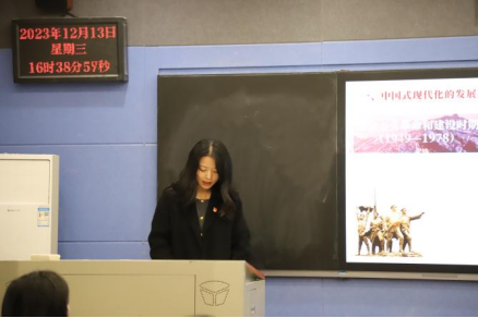 在“复兴之路”宣讲环节中,来自中国地质大学“复兴领航”宣讲团的曾峥和叶宗芝围绕中国式现代化这一主题分别进行讲述。曾峥同学对中国式现代化的发展过程进行宣讲。随后,叶宗芝同学分别对中国式现代化的本质内涵、鲜明特征、当代价值进行详细阐释,深刻把握中国式现代化五个特色,深入浅出、结合实际地对其所贡献出的中国智慧和中国方案进行了进一步讲解,展示了中国式现代化将彻底改写现代化的世界版图的重大意义和深远影响。