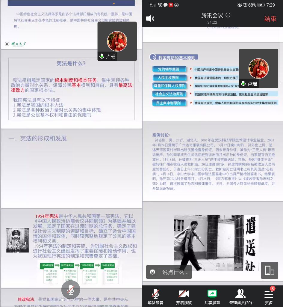 因疫情防控的要求,本次备课会以线上会议形式开展。湖北省第八届青年教师教学竞赛获奖者卢瑶老师受邀进行了精彩的授课展示和分享。在会议上,卢瑶老师主要从宪法的形成和发展、宪法的地位和基本原则、加强宪法的实施和监督等三个方面对“维护宪法权威”这一部分的教学内容进行梳理和讲解,其间列举孙志刚案、范冰冰偷逃税案等经典案例并加以深入解读。针对卢瑶老师的教学分享,白海霞、杨荣、翟艳芳等老师积极发表自己的体会与意见,德法课课程组全体老师们对如何有效开展法治部分的教学进行了热烈交流与探讨。
