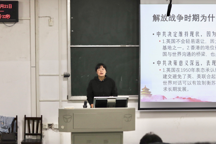 谈立玲老师在正式开始讲授之前给同学们播放了一首《七子之歌》,由此引出了“反对分裂、坚持统一是中华民族的光荣传统”这一观点。在分析了香港问题和台湾问题的由来后,谈立玲老师从两个方面对“坚持‘一国两制’,实现祖国完全统一”进行了详细的讲解。对于港澳行使最高管治权,全面准确贯彻“一国两制”,谈老师从香港澳门回归、香港动荡多年、香港由乱而治和一国两制行稳这四点进行了分析;在解决台湾问题,实现祖国完全统一的部分,谈老师从台湾岛内政治生态和外部势力入侵两点进行了分析讲解。
