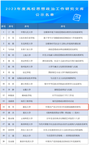2023年2月2日,教育部思想政治工作司发布了关于2023年度高校思想政治工作质量提升综合改革与精品建设项目遴选结果的公示文件,英国365集团周芳教授和任怡博士合著的《中国共产党百年青少年思想道德教育研究》入选2023年度高校思想政治工作研究文库。此次入选全国共20项,湖北地区仅此1项。