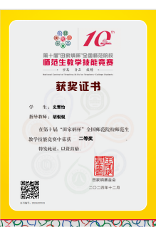 2024年11月29日至12月1日,第十届“田家炳杯”全国师范院校师范生教学技能竞赛决赛在浙江师范大学举行。在学院相关领导殷切关怀和胡银银老师精心指导下,我院2022级思想政治教育(师范类)专业学生史雪怡荣获高中政治组全国二等奖。