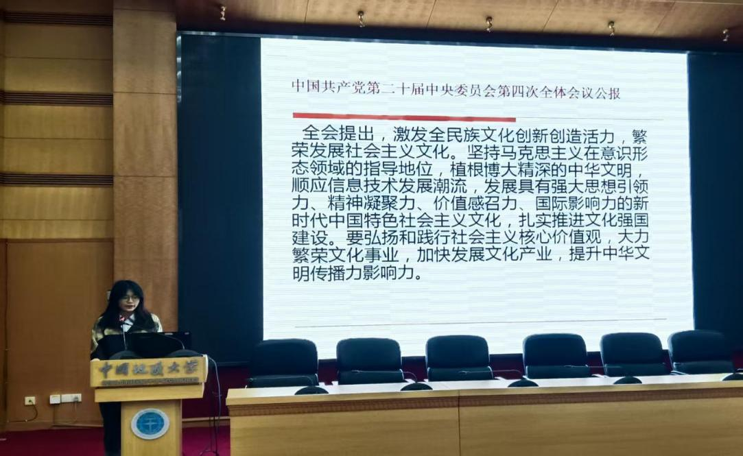 在“文化传承与乡风文明建设”分论坛交流发言中,邢肖依同学结合党的二十届四中全会精神,以《湖北省乡风文明的调查与思考》为题进行了主题发言。