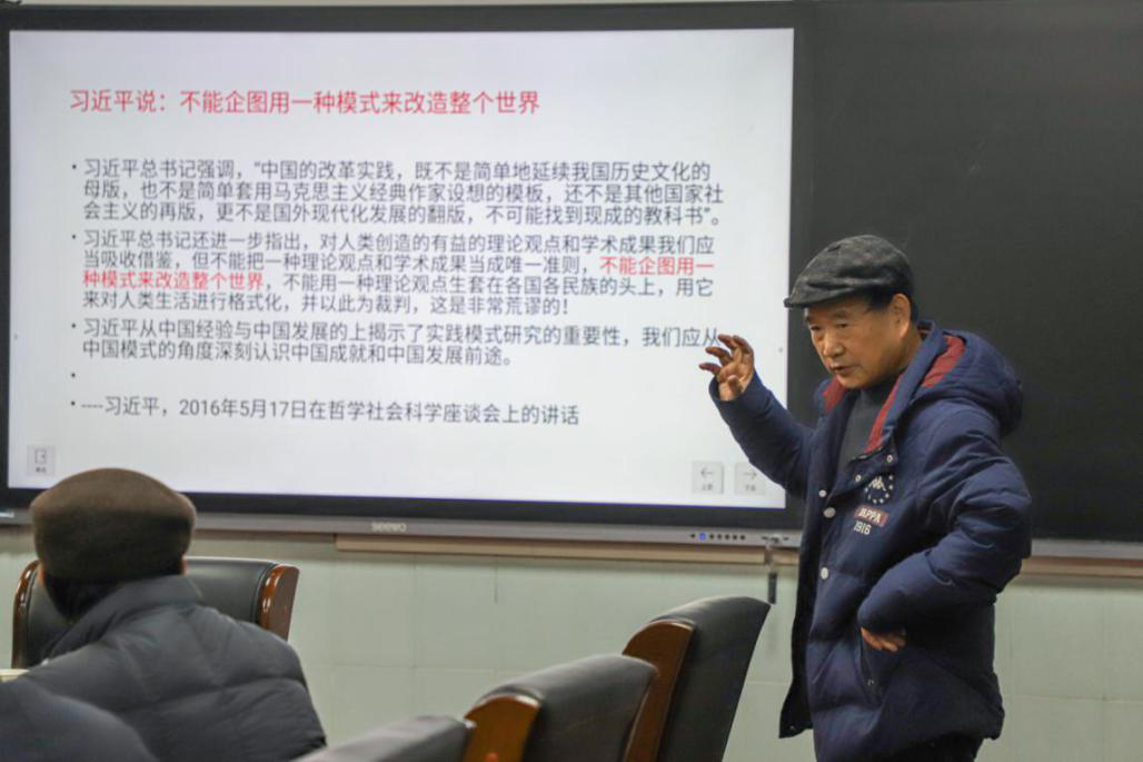 王宏波教授从“模式思维是习近平新时代中国特色社会主义思想的重要特点”“建构模式是社会工程的核心环节”“模式思维的意义”“中国改革的学理解释——改革模式的设计和实现问题是改革的方法论主题”“联系实际的新理念”等五个方面展开讲授。