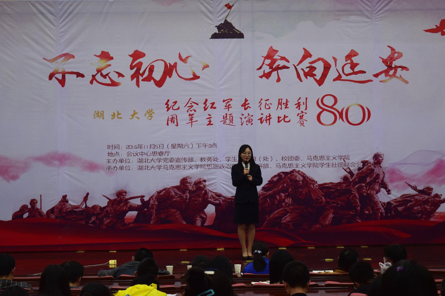 经过初赛和复赛的激烈角逐,共有来自学校各学院的18位选手脱颖而出参加此次决赛。即兴演讲环节,选手们围绕“民族精神与长征精神的关系”、“当代大学生如何传承长征精神”等主题,联系国内外发展环境和自身发展实际,深刻阐述了长征精神的当代价值、大学生传承和践行长征精神的重要意义等问题,引人深思。正式演讲环节,选手们或旁征博引,用慷慨激昂的语调吟诵称赞长征的诗词,表达自己的理想壮志,或深情讲述《一袋干粮》、《金色的鱼钩》等小故事,缅怀长征英雄,令全场观众动容。来自新闻传播学院的选手张慧静在讲到动情处更是情难自禁,赢得全场观众阵阵掌声。比赛中穿插的“互动环节”更是调动了全场观众的情绪,既普及了长征知识,又增添了活动的乐趣,整个活动高潮迭起。