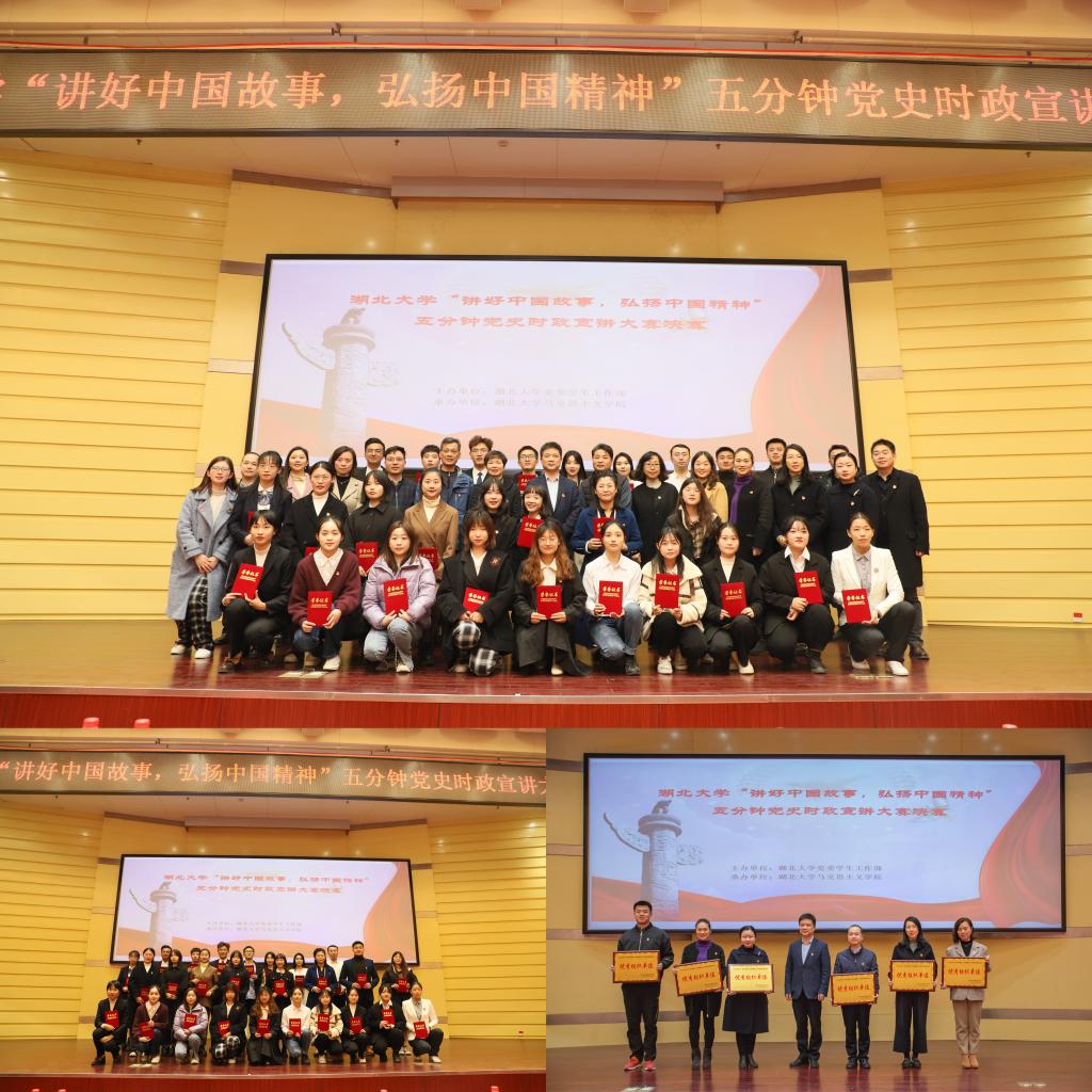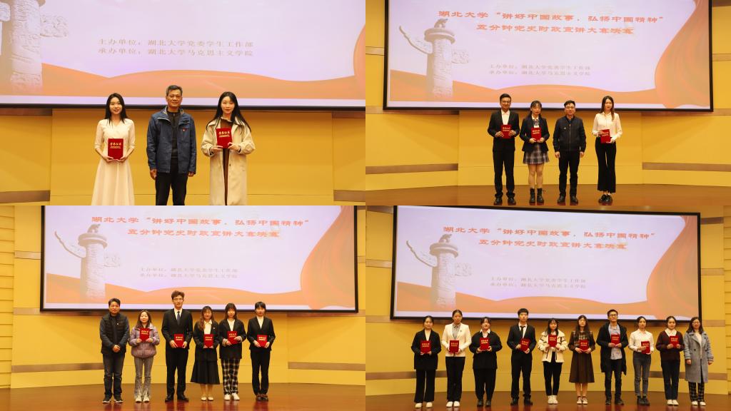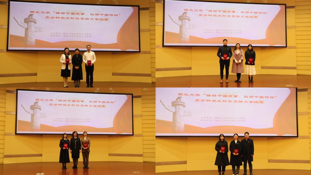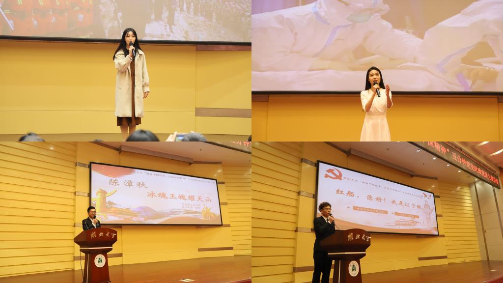 2019级播音与主持艺术专业学生司雨铮用丰富的图片和具有感染力的音乐,诠释了2020年武汉疫情背景下医疗战士们“舍小我,为大家”的伟大精神;2020级大数据经济专业学生邓范宇果讲述汶川大地震中幸存男孩程强受救援部队空15的感召,立志成为空降兵的故事,她号召大学生们听党话、感党恩、跟党走,同心向党,奔赴远方;“红船您好!我是辽宁舰”,2019级高分子材料与工程专业学生陈龙从南湖游船讲到南海巨舰,别出心裁地用两船对话的形式讲述建党百年来中国的发展变化;2019级思想政治教育专业学生依力扎提·依明讲述陈潭秋在新疆组织建设抗日民族统一战线的故事,“陈潭秋用热血和生命写就了共产党人的如山气节,成了敌人永远无法攻破的堡垒”;2020级文物与博物馆专业学生刘浩乐以《国际歌》为引,以实地考察的资料和图片,向大家展现武汉党史。