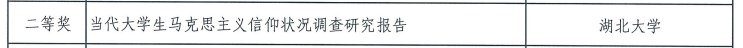 5月25日至26日,湖北省第十二届“挑战杯”大学生课外学术科技作品竞赛终审决赛暨闭幕式在武汉轻工大学举行。本届大赛以“科技创新志 青年报国行”为主题,由团省委、省科协、省教育厅、省学联主办,武汉轻工大学承办。我院2016级本科生团队作品《当代大学生马克思主义信仰状况调查研究报告》荣获省赛二等奖。