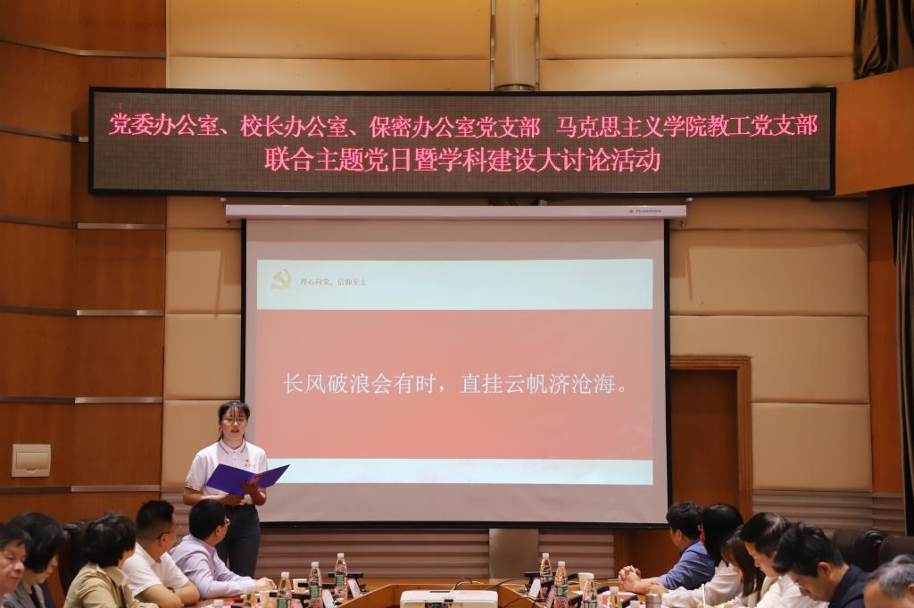 5月11日下午,马院教工党支部与校党委办公室、校长办公室、保密办公室党支部联合开展的主题党日暨学科建设大讨论活动在校会议中心思齐厅举行。校党委书记谢红星,校党委常委李莉,校党办、校办、保密办党支部全体党员,马院领导班子成员、教师代表、学生代表参加活动。活动由校党委常委,党委办公室、校长办公室、保密办公室党支部书记李莉主持。