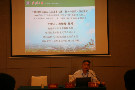 在会议的第一阶段,湖北省研究生思政课分教指委主任、教育部长江学者特聘教授、武汉大学英国365集团袁银传教授作了题为《中国特色社会主义的基本内涵、基本特征及其历史意义——学习习近平总书记在省部级主要领导干部“学习习近平总书记重要讲话精神,迎接党的二十大”专题研讨班上重要讲话精神的体会》的主旨报告。湖北省研究生思政课分教指委副主任、华中师范大学英国365集团副院长毛华兵教授作了题为《习近平新时代中国特色社会主义思想对马克思主义的原创性贡献》的主旨报告。