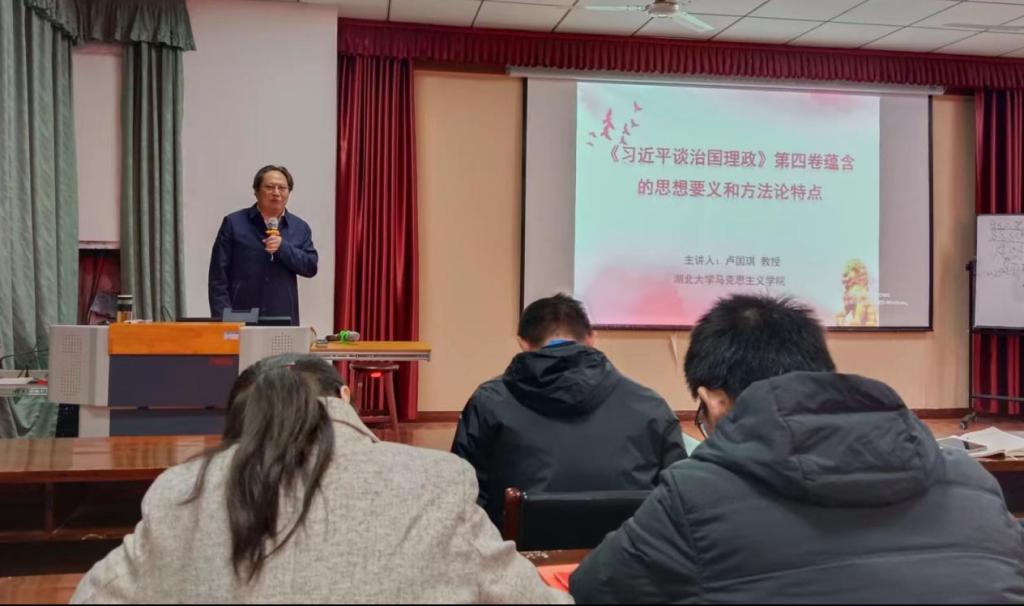 卢国琪教授从思想要义和方法论两个方面展开,深入系统地讲解了习近平新时代中国特色社会主义思想的核心要义,并通过结合实例,生动全面地展现了习近平总书记作为马克思主义政治家思想家战略家的深刻洞察力、敏锐判断力和理论创造力,重点梳理了《习近平谈治国理政》第四卷中所蕴含的战略布局的方法、统筹兼顾的方法、聚焦问题的方法、守住底线的方法和善于总结的方法。卢国琪教授在宣讲中既注重理论性和严肃性,又有不失生动活泼的旁征博引,言之有物论之有据,对《习近平谈治国理政》第四卷的思想要义和方法论在学院师生中的入脑入心起到了重要作用。