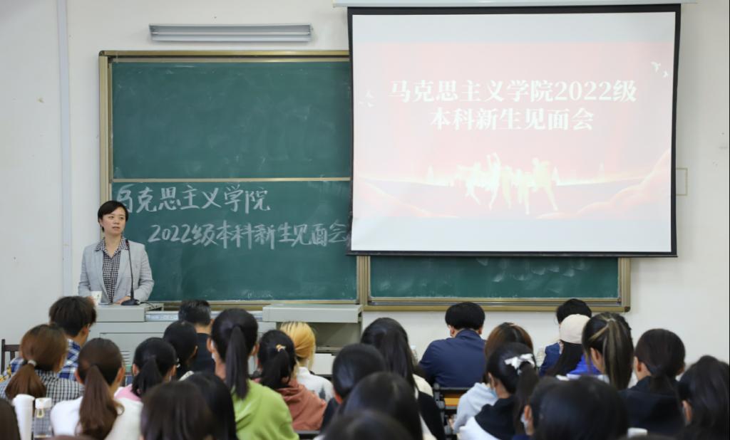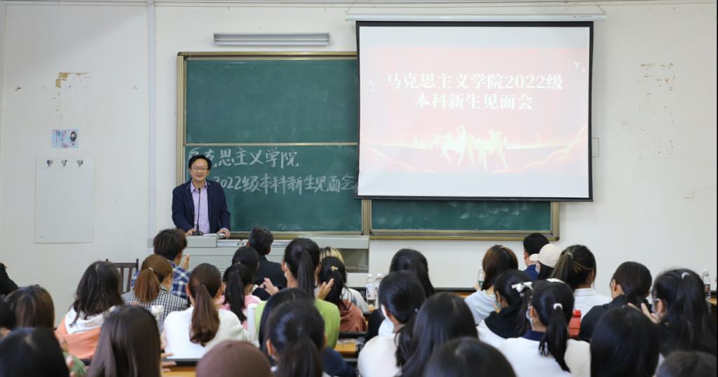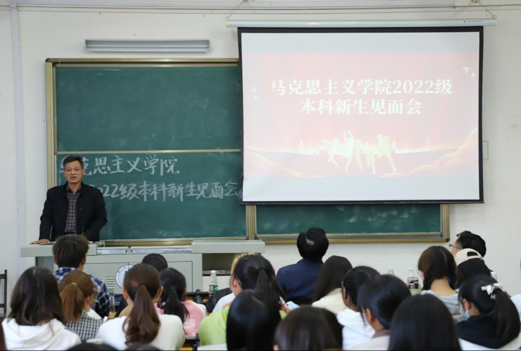 10月19日下午,我院2022级本科生新生师生见面会在阳逻校区B403教室举行。学院党委书记刘柏林,院长熊友华,党委副书记晏妮,副院长易振龙、徐信华,新生班主任王昊、邹浩,通识教育学院辅导员史健桥以及2022级本科生新生参加见面会。会议由院党委副书记晏妮主持。