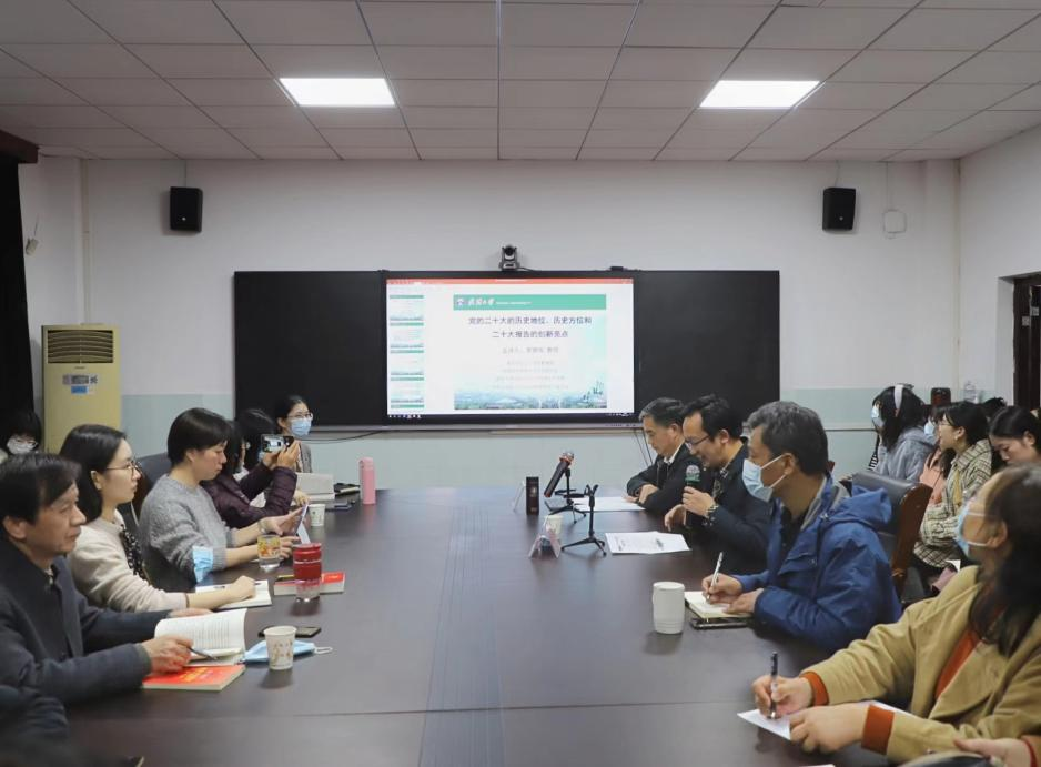 2022年11月17日,教育部长江学者特聘教授、武汉大学英国365集团袁银传教授在学院四楼2号会议室以《党的二十大的历史地位、历史方位和二十大报告的创新亮点》为题,宣讲党的二十大精神。学院教师和马克思主义理论专业的硕士及博士研究生参加报告会,学院院长熊友华教授主持报告会。