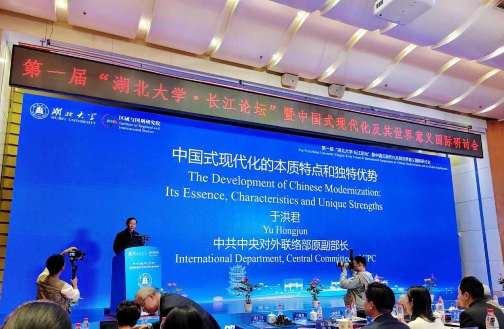 此次论坛下设“中国式现代化的内涵”“中国式现代化与全球治理”“中国式现代化的世界意义与比较研究”三个单元,以及“中国式现代化与长江文化”“中国法律现代化及其世界意义”两个分论坛。中共中央对外联络部原副部长于洪君,中国外交部拉丁美洲和加勒比司司长蔡伟,湖北省人民政府副秘书长何丽君,湖北省人民政府外事办公室主任章笑梅,中国社会科学院拉丁美洲研究所荣誉学部委员徐世澄研究员,中国人民大学国际关系学院金灿荣教授,中央党校国际战略研究院副院长吴志成教授,南京大学区域国别研究院王逸舟教授等专家学者出席会议并发言。我校校长刘建平教授代表学校致辞,校党委副书记祝欣主持会议开幕式。我院贺祥林教授、副院长易振龙教授,以及龚梦、胡银银、王敏、陈晨、王勇、沈钰晶、冷自衍等年轻老师参会。博士研究生刘秋岑、田敬参加会议并在分论坛作学术发言。