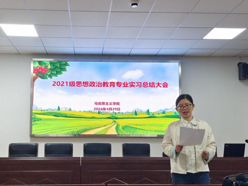 (通讯员刘晨昊 宋佳雪)4月29日下午四点,我院于二号教学楼410教室召开2021级思想政治教育专业学生教育实习总结大会。我院教学副院长徐信华、部分实习指导教师以及全体2021级思想政治教育专业学生参加会议,政教系主任胡银银主持本次会议。